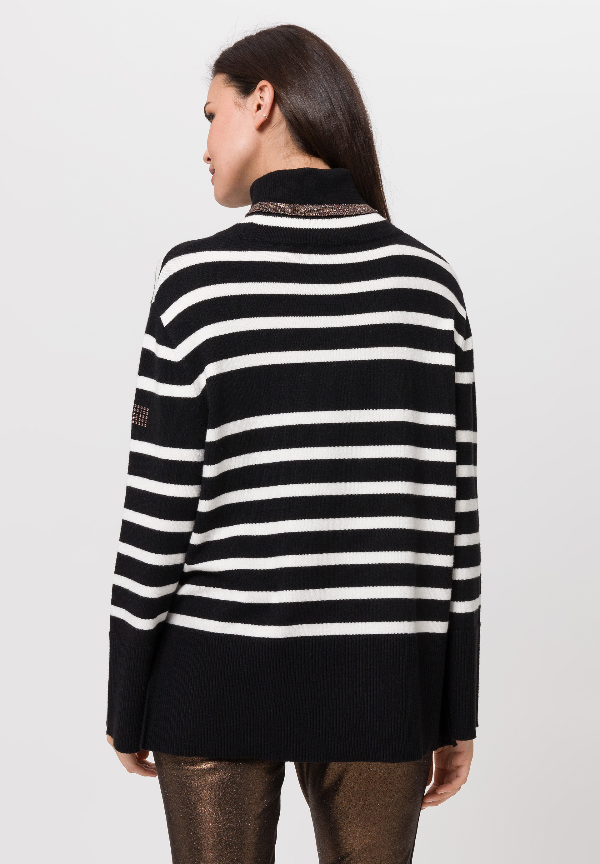 Lässiger gehts nicht. Der Pullover setzt mit seiner weichen Strickqualität und dem weiten Fit auf einen coolen Look und absoluten Tragekomfort. Das klassische Streifendesign wird akzentuiert durch einen Lurexstreifen am Rollkragen. Vorne und am Ärmel sorgen Steinchen für einen kleinen Glam-Faktor. Damit ist der Strickpulli perfekt geeignet um ihn im Alltag zu tragen und lässig oder edel zu kombinieren.