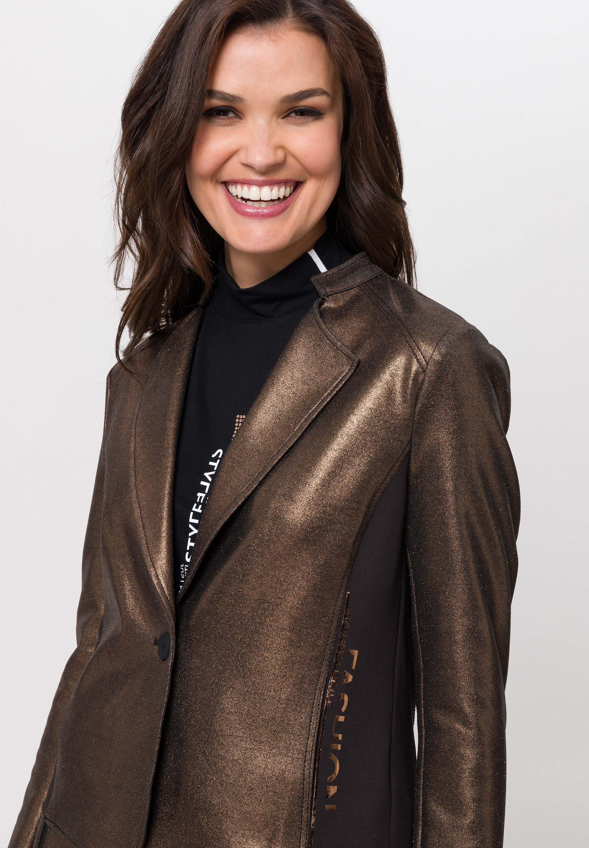 This blazer will add eye-catching quality to any look, as the shimmering metallic look attracts everyone's attention. It is slightly tailored and cut a little shorter than normal. The sides feature single-slit pockets and elasticated jersey inserts for optimum freedom of movement and a sporty look. In addition to the typical lapel, the blazer is designed with a narrow stand-up collar.
