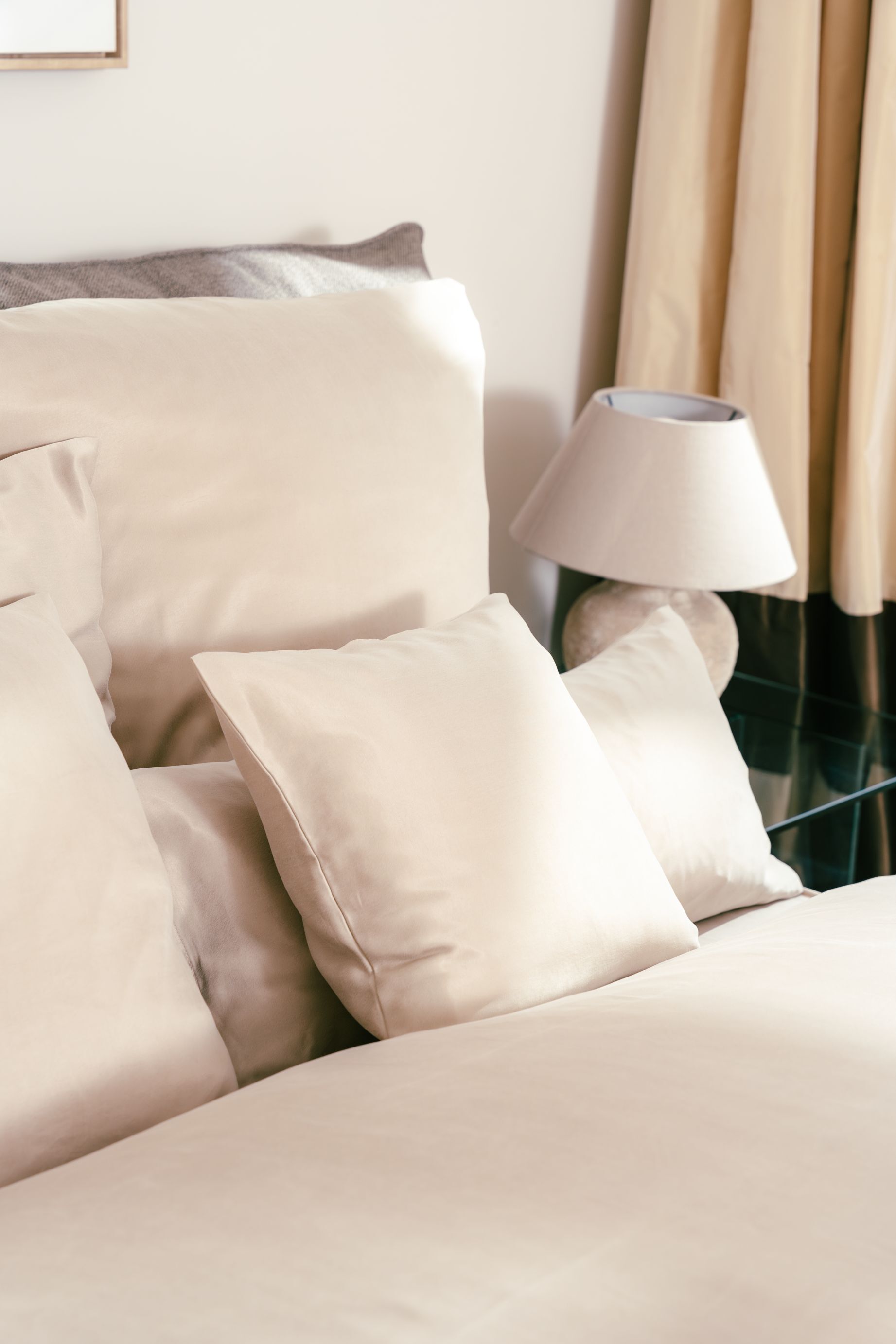 Add a touch of luxury to your bedroom with our elegant cupro cushion cover measuring 40 x 80 cm. This cover is not only a stylish accessory, but also an excellent choice for your well-being and skin care. Made from high-quality, sustainable cupro, this cushion cover feels incredibly soft against the skin. The smooth surface reduces friction and protects your hair from frizz and split ends.