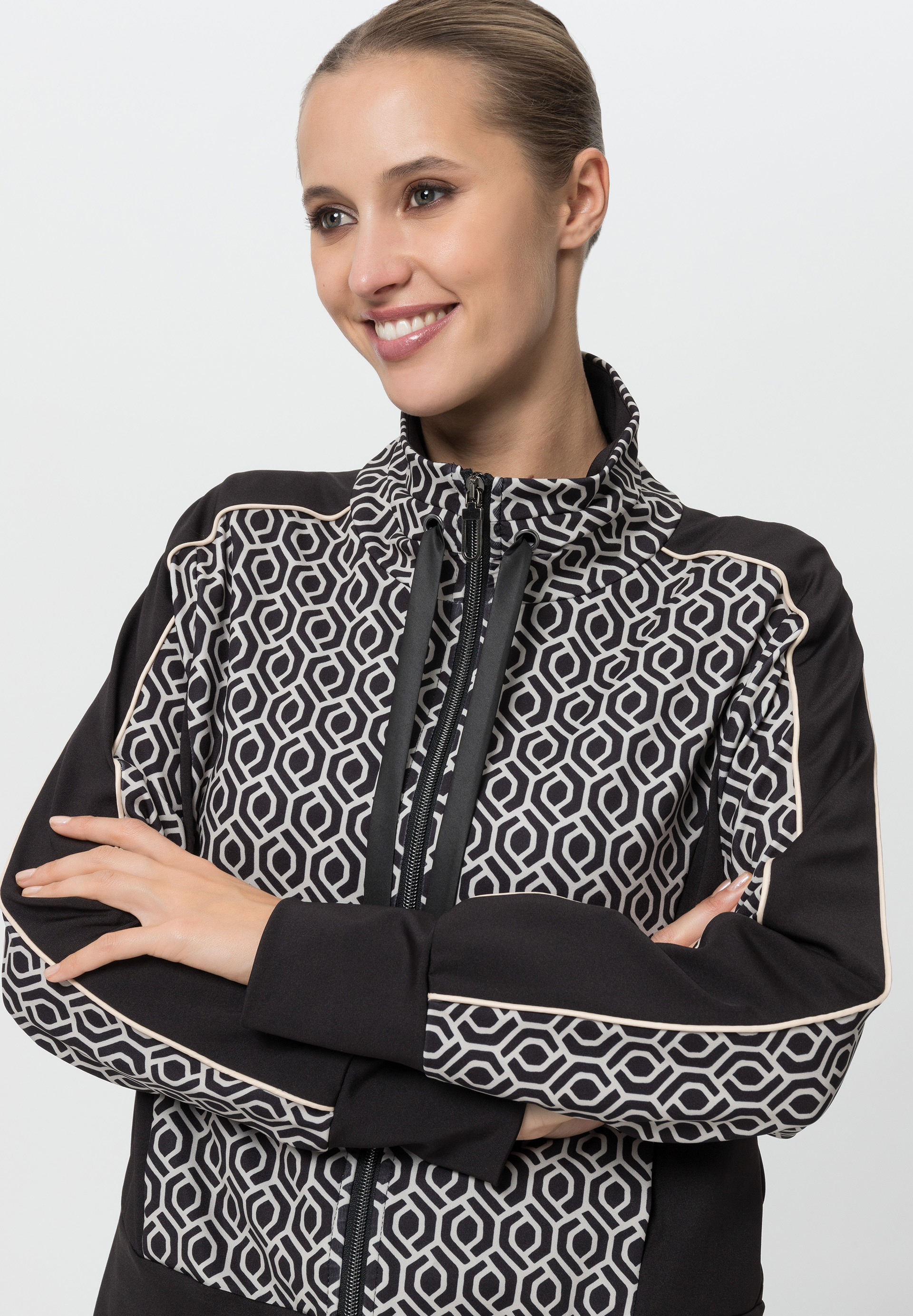 This jacket for high-quality leisure styles has a straight cut and is made from an elasticated material blend. The focus here is on optimum comfort, as well as the striking look of the combination of an all-over pattern and plain-coloured inserts. The jacket can be styled individually thanks to the 2-way zip fastening. The stand-up collar with a drawstring ties comfortably around the neck and gives the jersey jacket a sporty touch.